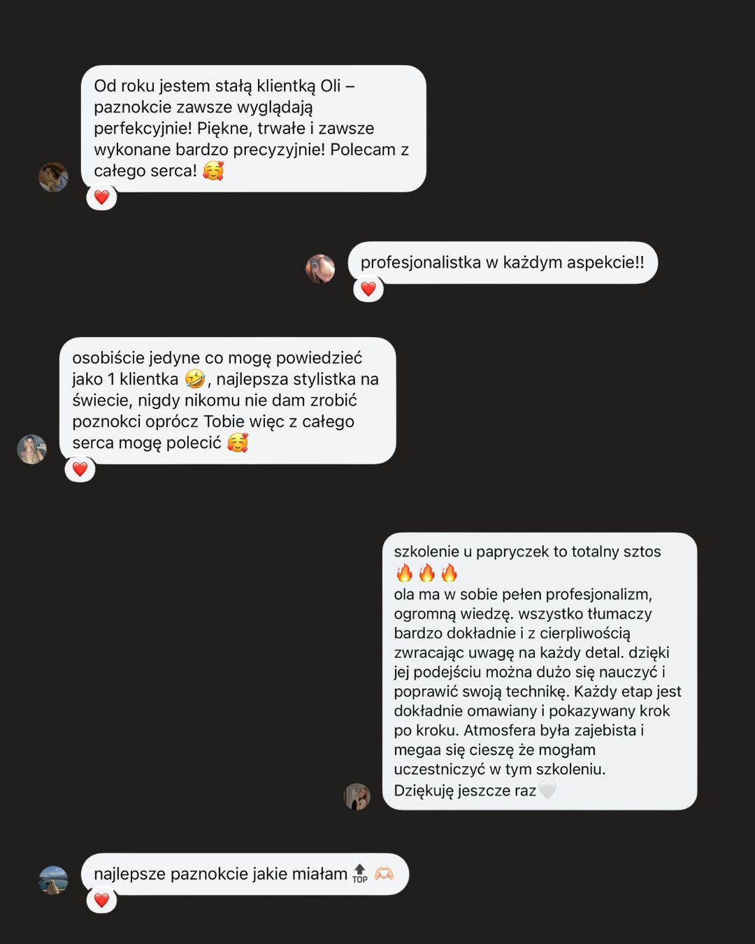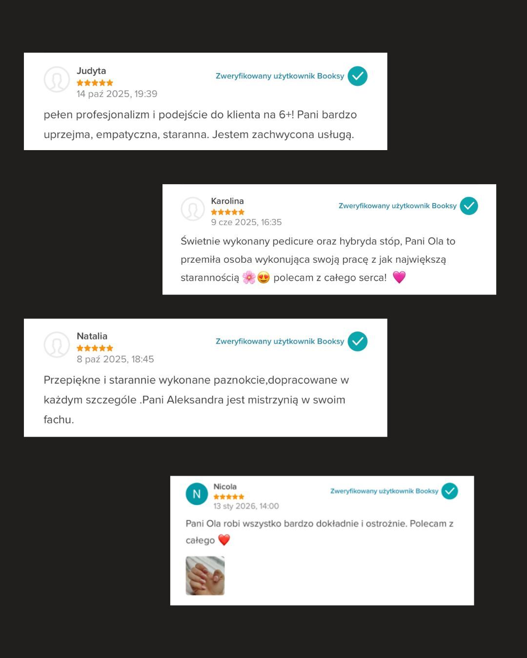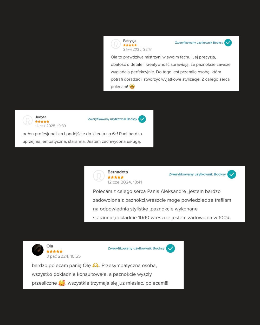 Pomagam kobietom, które mają dość byle jakich paznokci robionych „na szybko”, w końcu mieć stylizacje, które naprawdę wyglądają dobrze i się trzymają — bez wyrzucania pieniędzy w błoto — bo u mnie robi się to porządnie i świadomie.